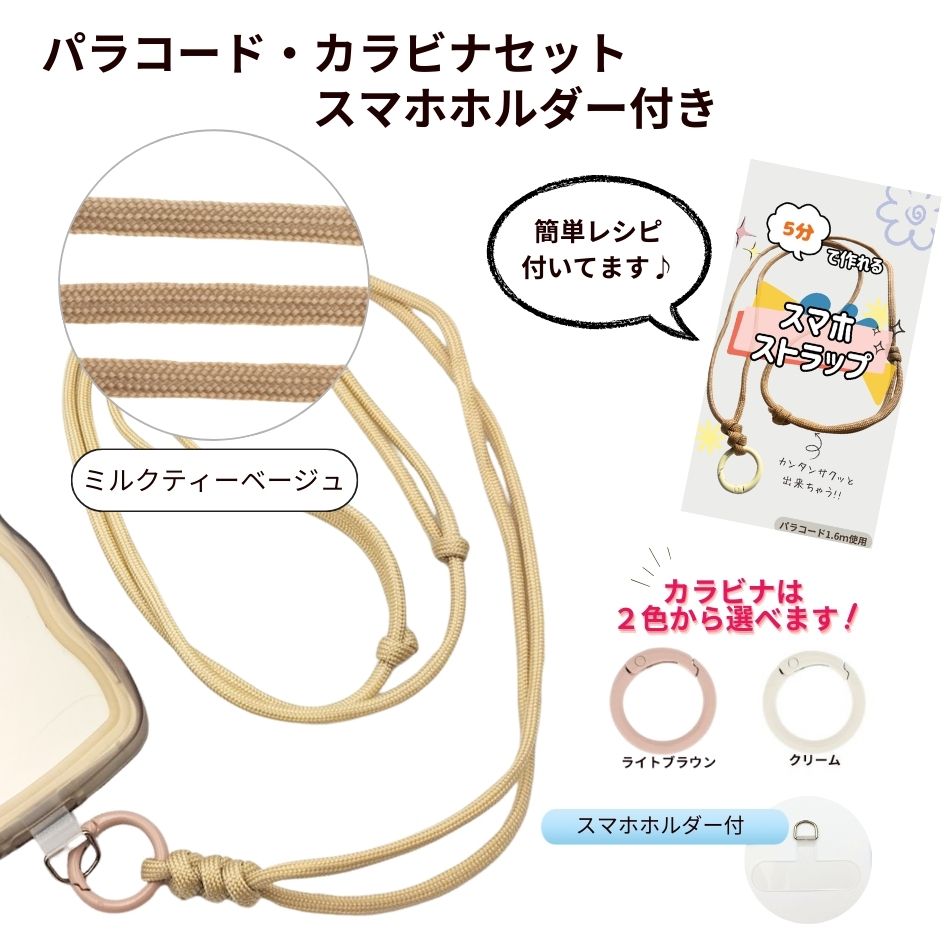 パラコード カラビナセット スマホホルダー付き [ ミルクティーベージュ ] 選べるカラビナカラー 紐 ロープ ハンドメイド O-05