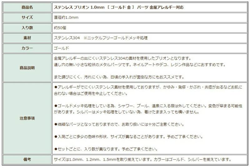 商品名 ステンレス ブリオン 1.0mm [ ゴールド 金 ] パーツ 金属アレルギー対応