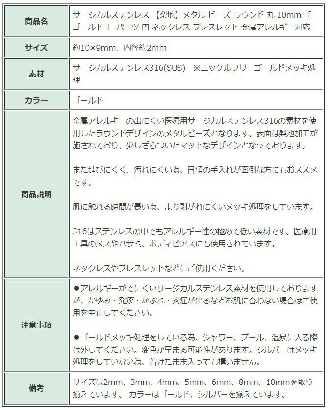 商品名 サージカルステンレス 【梨地】メタル ビーズ ラウンド 丸 10mm [ ゴールド ] パーツ 円 ネックレス ブレスレット 金属アレルギー対応
