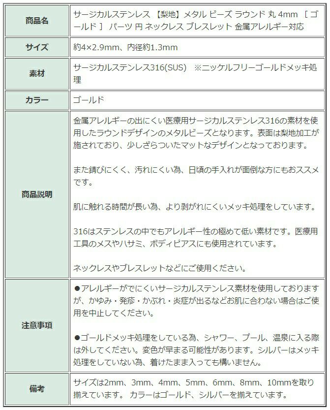 商品名 サージカルステンレス 【梨地】メタル ビーズ ラウンド 丸 4mm [ ゴールド ] パーツ 円 ネックレス ブレスレット 金属アレルギー対応