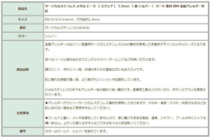 商品名 サージカルステンレス メタル ビーズ 【 スクエア 】 5.5mm [ 銀 シルバー ] パーツ 素材 材料 金属アレルギー対応