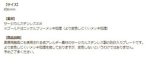他の画像を見る 金アレ 316 素材 ニッケルフリー パーツ メタル ネックレス 敏感肌 [5個] 316 タグ プレート 丸 6mm 小 刻印 [ ゴールド 金 ] サージカルステンレス ネックレス パーツ 金属アレルギー 対応 M1-03 当店特別価格 ¥ 449 税込 カートに入れる お気に入りに登録する