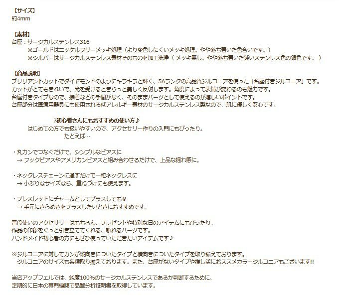 他の画像を見る 金属アレルギー 素材 お手入れ簡単 316 銀色 素材 金具 [1個] ヨコ向き 台座 キュービックジルコニア 《 4mm 》 [ 銀 シルバー ] サージカルステンレス チャーム カン付き パーツ 金属アレルギー対応 O-03 当店特別価格 ¥ 179 税込 カートに入れる お気に入りに登録する
