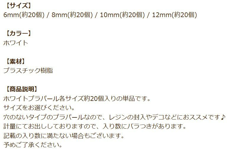 他の画像を見る アクセサリーパーツ ハンドメイド 材料 クラフト パール 特価 レジン 封入 デコ 穴なし プラパール [ ホワイト ] 各サイズ単品 6mm(約20個) 8mm(約20個) 10mm(約20個) 12mm(約20個) レジン 封入パーツ デコパーツ フェイクパール 樹脂パール O-05 当店特別価格 ¥ 179 税込 カートに入れる お気に入りに登録する