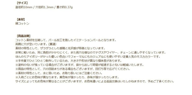 [4個] コットンパール 【 両穴 】 10mm * キスカ * 丸 パーツ 素材 O-01