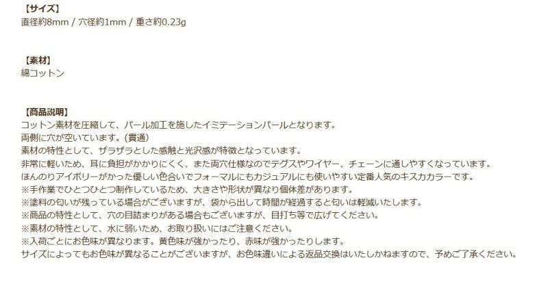 [4個] コットンパール 【 両穴 】 8mm * キスカ * 丸 パーツ 素材 O-01