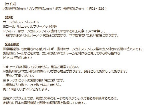 サージカルステンレスパーツ専門店のアップフェルが取り扱うステンレスのピアスパーツ(ピアス金具)は金属アレルギーの方でも安心してつけることができるサージカルステンレス316素材を採用しています。