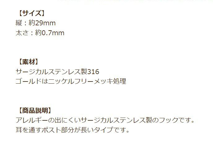 ピアスフックは硬い特徴のあるステンレスでもおしゃれを楽しめるように細くて華奢なデザインもありますし、大きなモチーフをしっかり受け止める大きいフックピアスがあります。