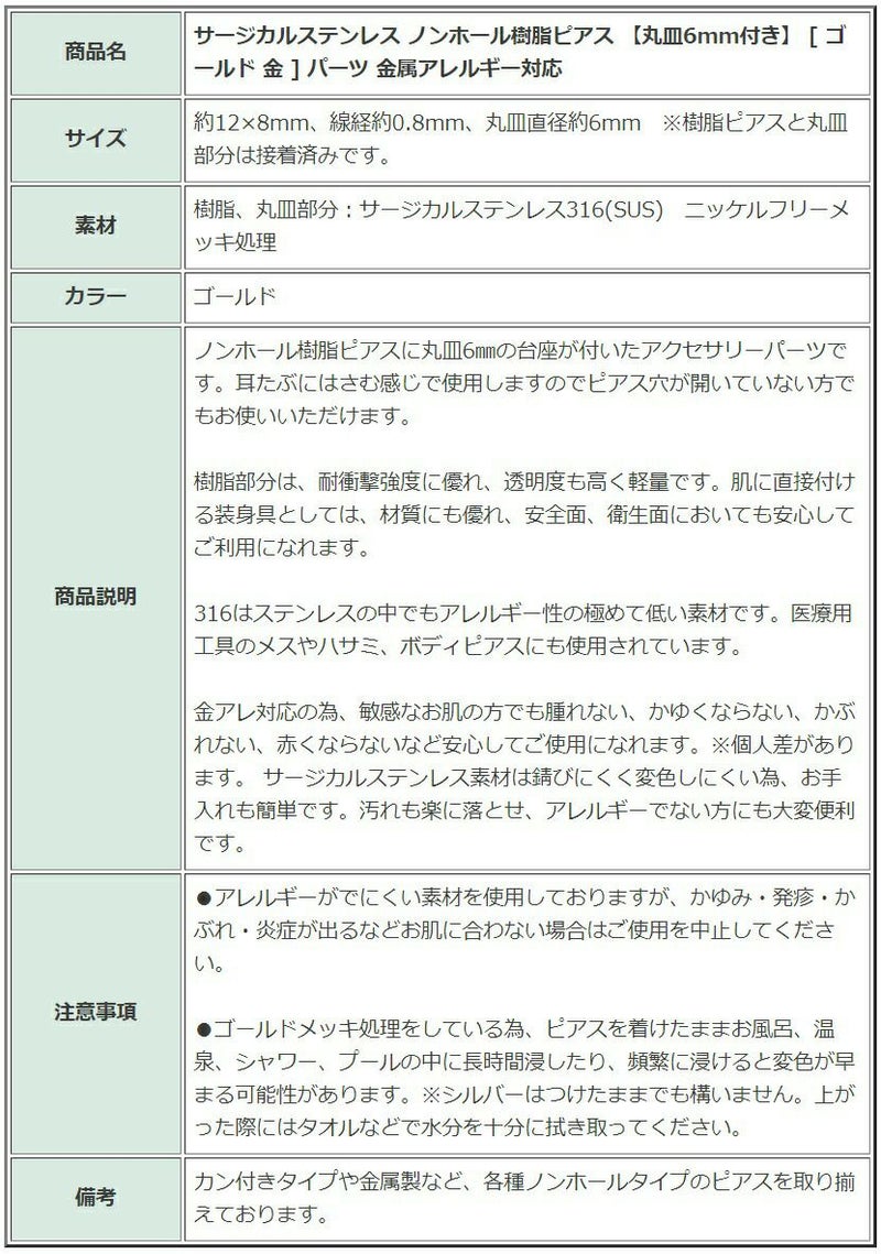 商品名 サージカルステンレス ノンホール樹脂ピアス 【丸皿6mm付き】 [ ゴールド 金 ] パーツ 金属アレルギー対応