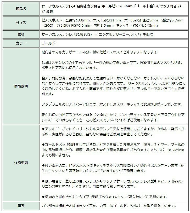 他の画像を見る 金属アレルギー 医療用 材料 ニッケルフリー 316 金アレ [100個] ヨコ向きカン付き ボールピアス 3mm [ ゴールド 金 ] サージカルステンレス キャッチ付き アクセサリー パーツ 金具 P2-01 当店特別価格 ¥ 2,899 税込 カートに入れる お気に入りに登録する