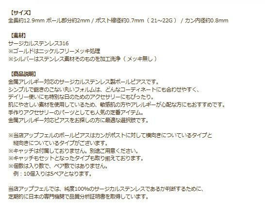 他の画像を見る 金属アレルギー 医療用 素材 お手入れ簡単 316 低アレルギー [10個] 【 ポストのみ 】 ヨコ向きカン付き ボールピアス 2mm [ ゴールド 金 ] サージカルステンレス パーツ 金属アレルギー対応 P2-01 当店特別価格 ¥ 399 税込 カートに入れる お気に入りに登録する