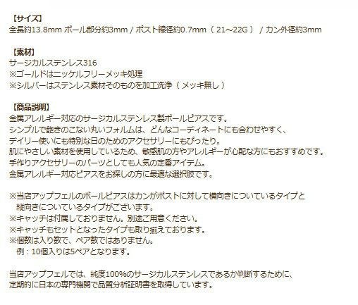 他の画像を見る 金属アレルギー 医療用 材料 ニッケルフリー 316 金アレ [50個] ヨコ向きカン付き ボールピアス 3mm [ ゴールド 金 ] サージカルステンレス キャッチ付き アクセサリー パーツ 金具 P2-01 当店特別価格 ¥ 1,499 税込 カートに入れる お気に入りに登録する