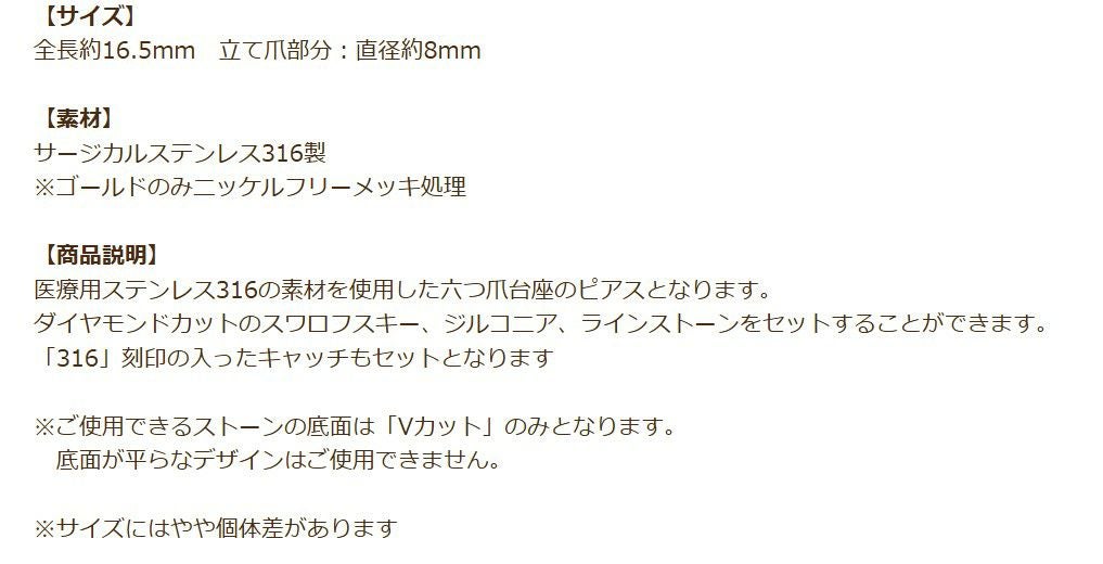 他の画像を見る 金属アレルギー 医療用 素材 お手入れ簡単 316L 金具 資材 [10個] 立て爪6mm ピアス [ ゴールド 金 ] サージカルステンレス キャッチ付き 石座 石枠 P2-02 パーツ 金属アレルギー 当店特別価格 ¥ 599 税込 カートに入れる お気に入りに登録する