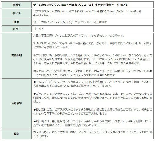 他の画像を見る 金属アレルギー 医療用 素材 お手入れ簡単 316 [200個] 丸皿4mm ピアス [ゴールド金] キャッチ付き サージカルステンレス P1-01 パーツ 金属アレルギー 当店特別価格 ¥ 3,299 税込 カートに入れる お気に入りに登録する