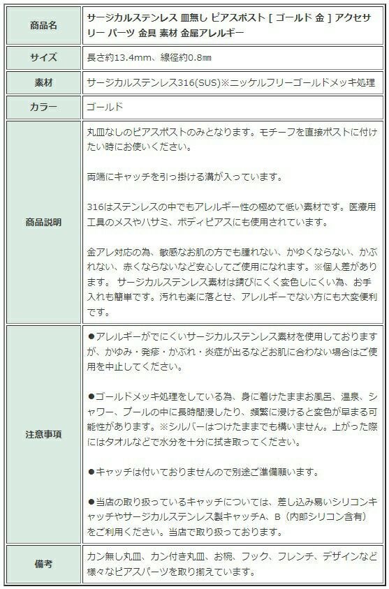 他の画像を見る 金アレ 材料 素材 お手入れ簡単 316 金具 ニッケルフリー [50個] サージカルステンレス 皿無し ピアスポスト [ ゴールド 金 ] アクセサリー 素材 金属アレルギー対応 ピアス ポスト ロウ 付け P2-05 当店特別価格 ¥ 1,185 税込 カートに入れる お気に入りに登録する