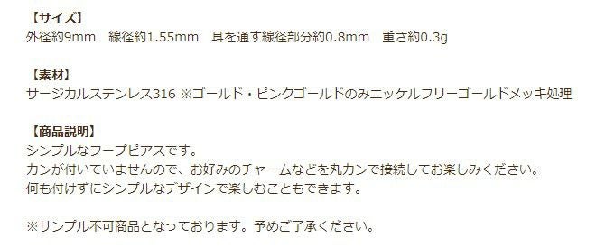 他の画像を見る 金アレ 316 素材 材料 金具 フープ アレルギー対応パーツ ニッケルフリー 敏感肌 [10個] 【 フープピアス 】 C * 9mm *[ ゴールド 金 ] サージカルステンレス シンプル パーツ 金属アレルギー対応 P3-02 当店特別価格 ¥ 2,599 税込 カートに入れる お気に入りに登録する