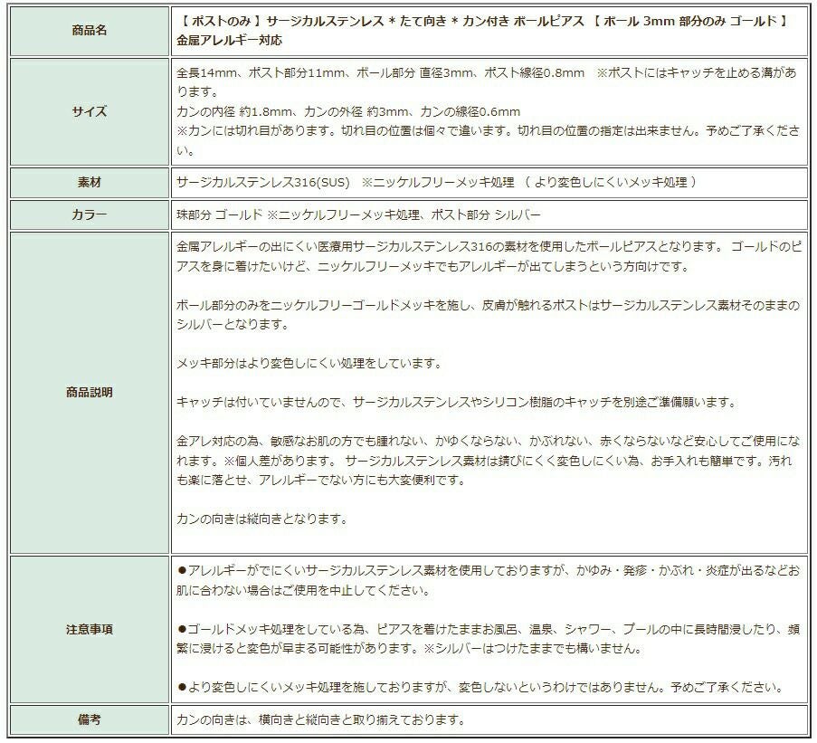 他の画像を見る 金属アレルギー 医療用 素材 お手入れ簡単 316 [50個] サージカルステンレス ロングポスト ヨコ向き カン付き ボールピアス 3mm [ ゴールド 金 ] キャッチ付き パーツ 金属アレルギー対応 当店特別価格 ¥ 2,715 税込 カートに入れる お気に入りに登録する