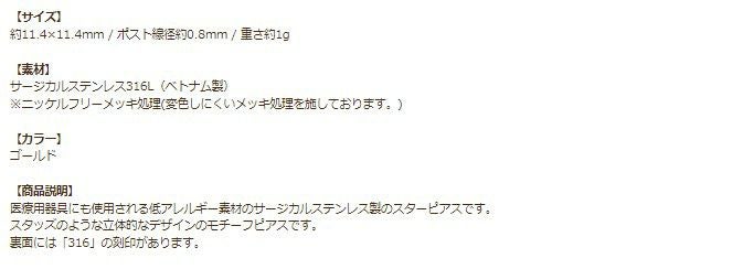 他の画像を見る 金アレ 316 素材 星 モチーフ ピアス ニッケルフリー 敏感肌 [ 2個 ] サージカルステンレス * スタッズ * スターピアス ベルキャッチ付き [ ゴールド 金 ] ベルキャッチ付き パーツ 金属アレルギー対応 P1-05 当店特別価格 ¥ 1,699 税込 カートに入れる お気に入りに登録する