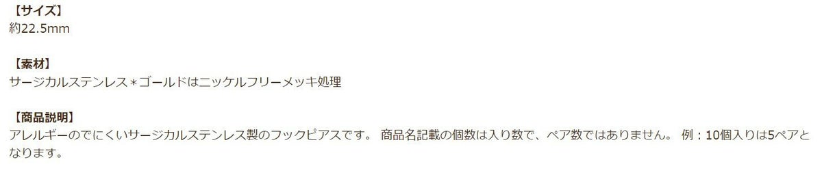 他の画像を見る 金属アレルギー 医療用 素材 お手入れ簡単 316L [10個] ひっかけタイプ フープピアス 20mm [ ゴールド 金 ] サージカルステンレス アクセサリー パーツ 金具 金アレ P3-04 当店特別価格 ¥ 479 税込 カートに入れる お気に入りに登録する