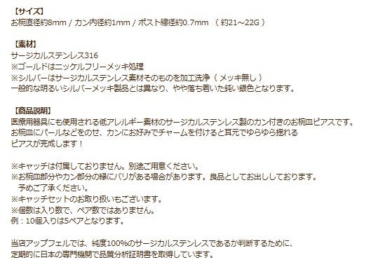 医療用器具にも使用される低アレルギー素材のサージカルステンレス製のカン付きのお椀皿ピアスです。