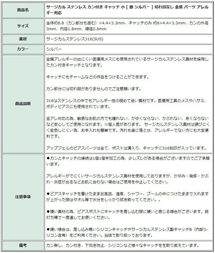 商品説明 金属アレルギーの出にくい医療用メスにも使用されているサージカルステンレス素材を採用したカン付きキャッチとなります。