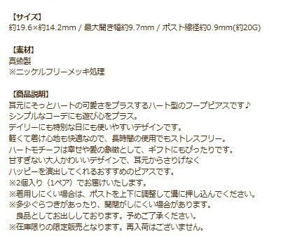 他の画像を見る 金アレ 真鍮 金具 フープ ハート ニッケルフリー [2個] ハート かっちん ピアス[ ゴールド 金 ] 真鍮製 フープピアス パーツ 金属アレルギー対応 韓国製 P3-02 当店特別価格 ¥ 399 税込 在庫切れ 再入荷お知らせ お気に入りに登録する