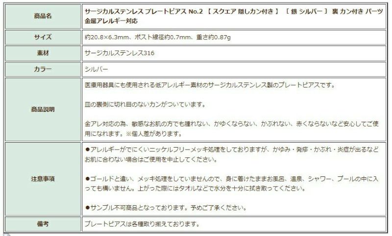 商品説明 医療用器具にも使用される低アレルギー素材のサージカルステンレス製のプレートピアスです。