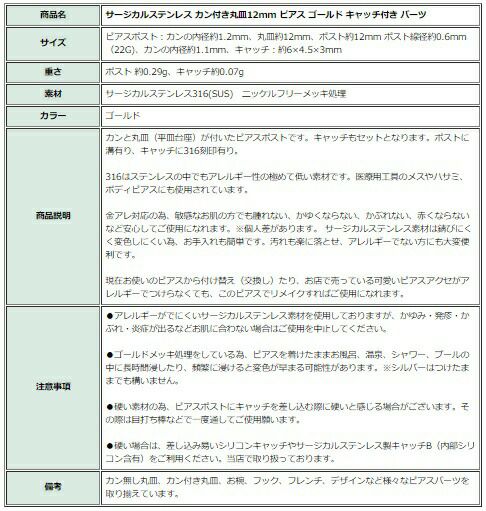 サージカルステンレス カン付き丸皿12mm ピアス ゴールド キャッチ付き パーツ |