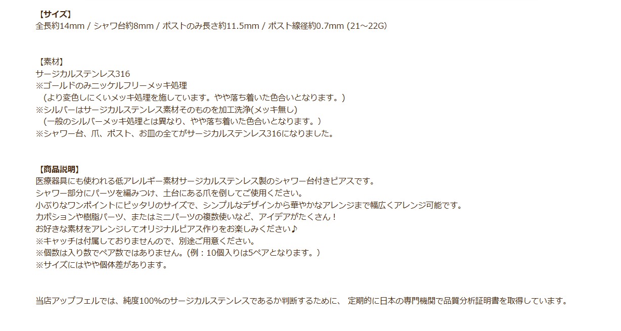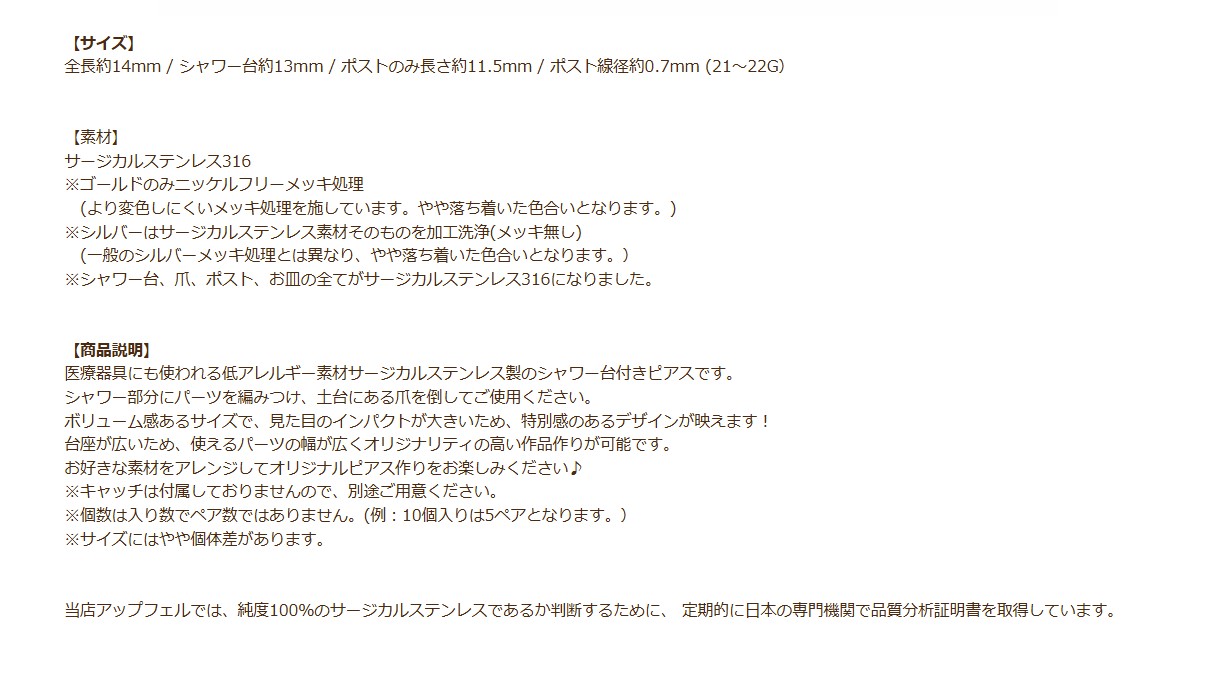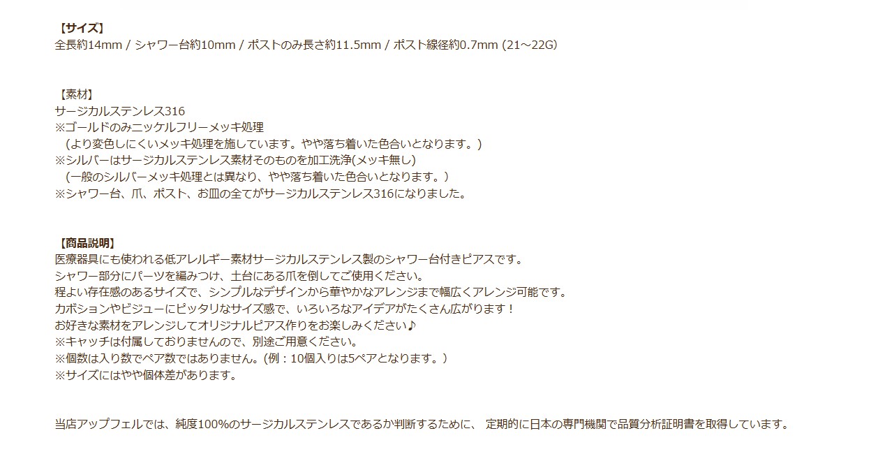 金属アレルギー対応の医療用ステンレスのシャワー台ピアスを買うならココ!!