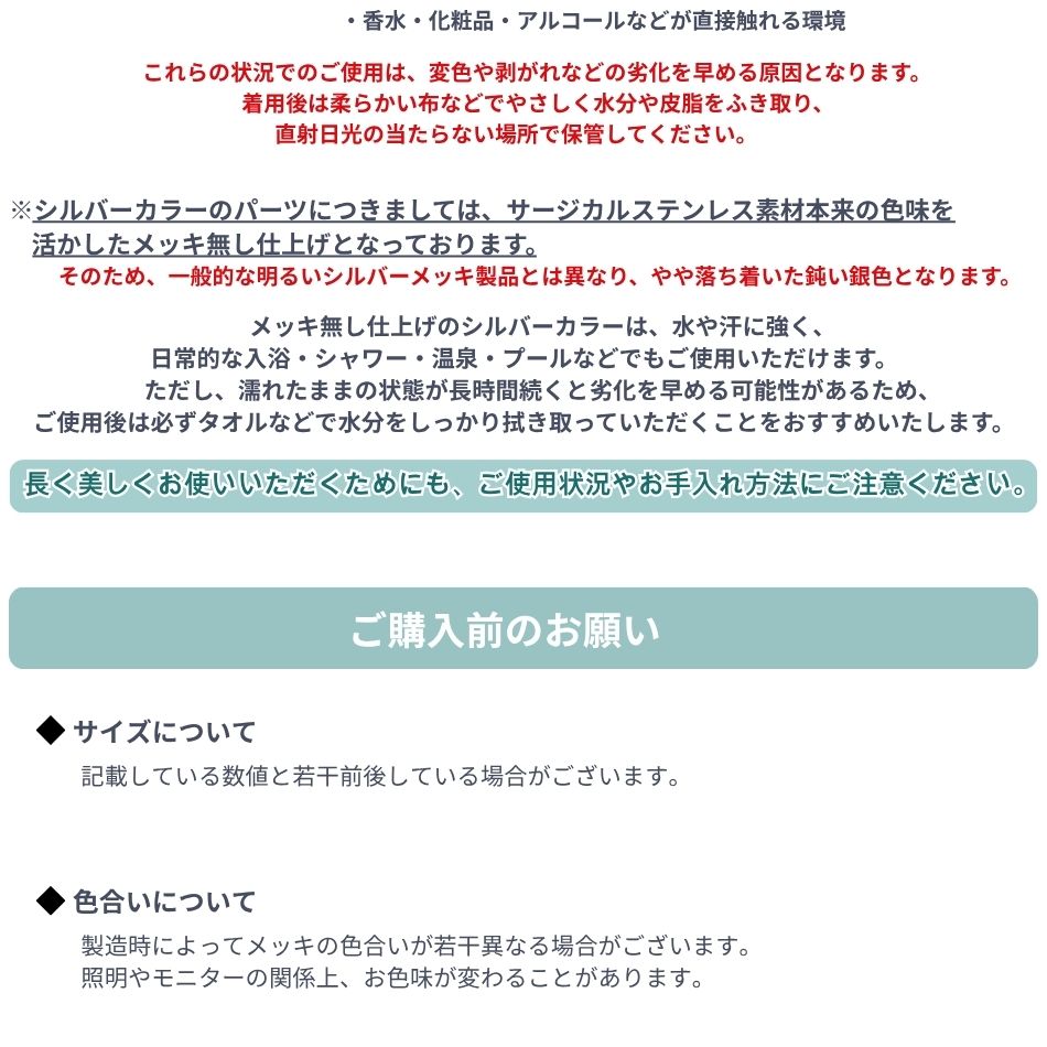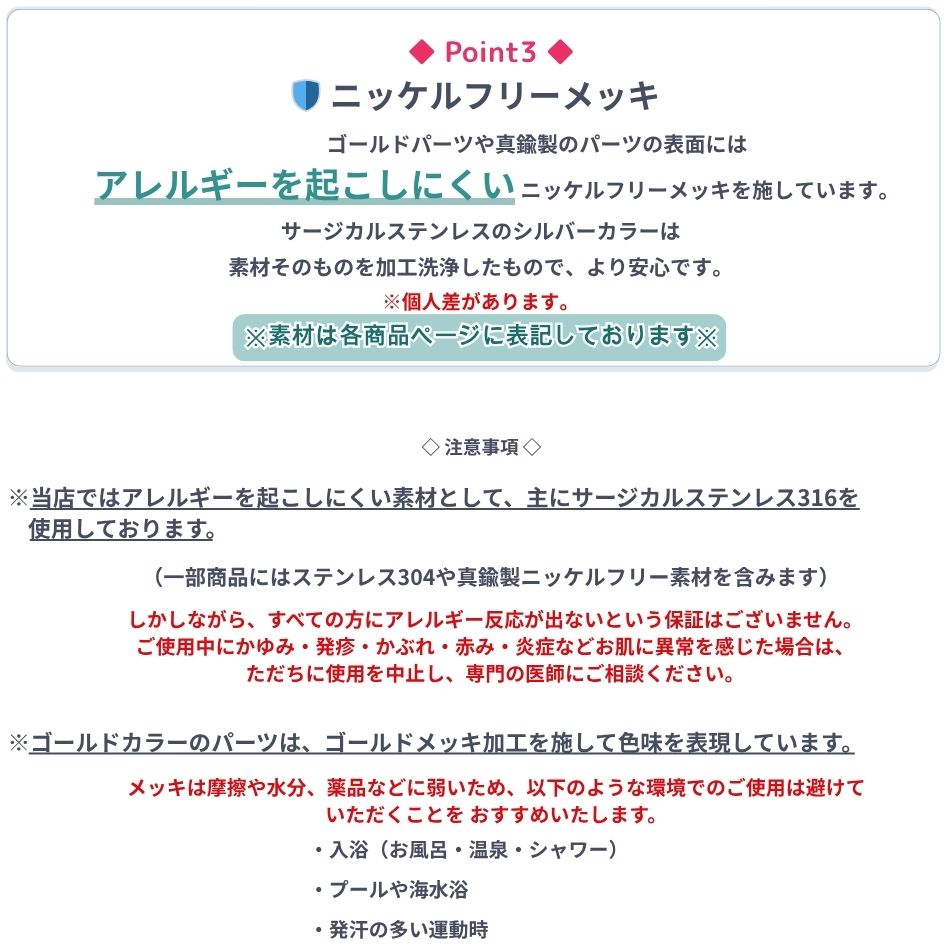 変色しにくい、かぶれないシャワーピアス金具で安心という喜びのお声を多数頂戴しております。