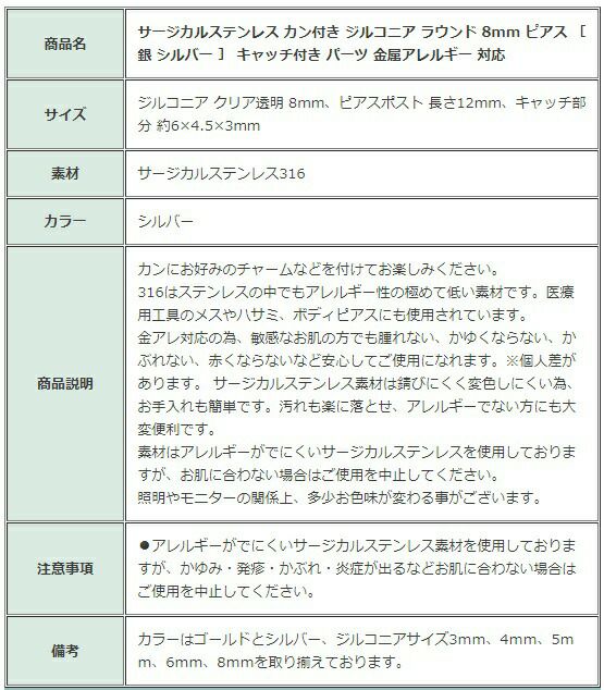 商品名 サージカルステンレス カン付き ジルコニア ラウンド 8mm ピアス [ 銀 シルバー ] キャッチ付き パーツ 金属アレルギー 対応