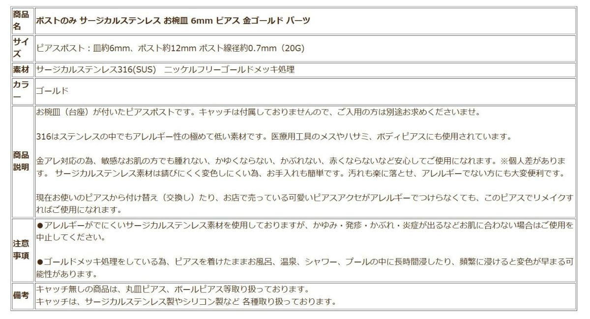 他の画像を見る 金属アレルギー 医療用 素材 お手入れ簡単 316 低アレルギー [20個] 【 ポストのみ 】 お椀皿 6mm ピアス [ ゴールド 金 ] サージカルステンレス P1-03 パーツ 金属アレルギー対応 当店特別価格 ¥ 633 税込 カートに入れる お気に入りに登録する