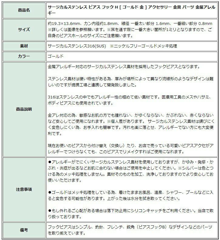 他の画像を見る 金属アレ 医療用 素材 お手入れ簡単 316 かぶれない [10個] ピアス フック H [ ゴールド 金 ] アクセサリー 金具 サージカルステンレス パーツ 金属アレルギー 当店特別価格 ¥ 1,798 税込 カートに入れる お気に入りに登録する