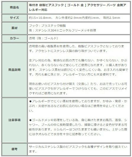 他の画像を見る プラスチック フック アクセサリー パーツ 樹脂 資材 [ 10個 ] 珠付き 樹脂ピアスフック [ ゴールド 金 ] ステンレス P3-05 アクセサリー パーツ 金属アレルギー対応 当店特別価格 ¥ 369 税込 カートに入れる お気に入りに登録する