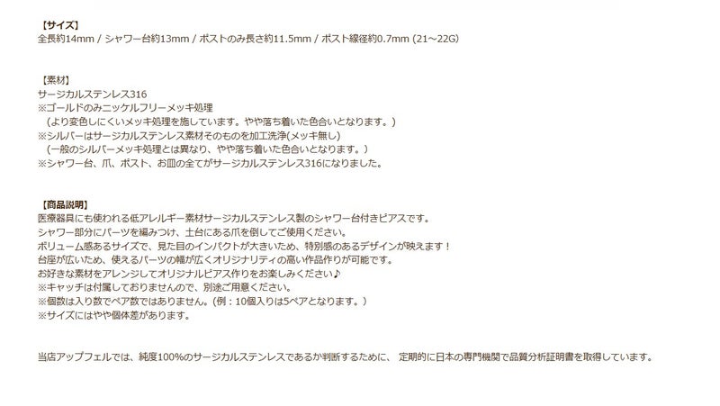 [10個]【 ポストのみ 】 シャワー 台付き *ピアス* 13mm [ ゴールド 金 ] サージカルステンレス 金具 パーツ 金属アレルギー