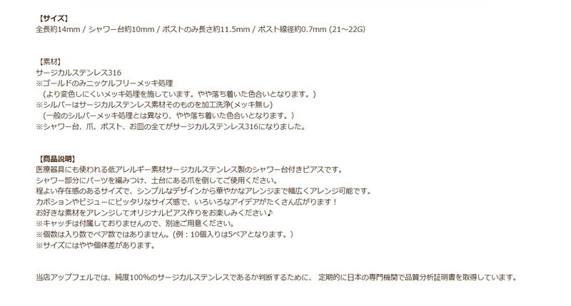 [20個]【 ポストのみ 】 シャワー 台付き *ピアス* 10mm [ ゴールド 金 ] サージカルステンレス 金具 パーツ 金属アレルギー