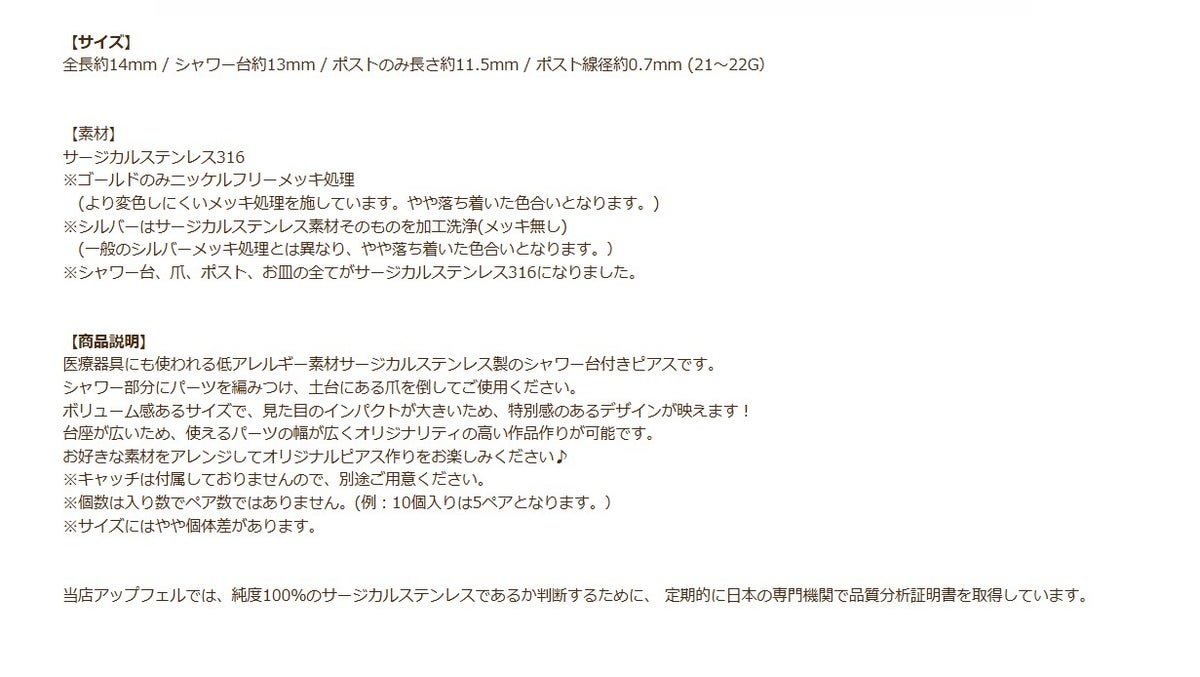 他の画像を見る ニッケルフリーメッキ 低アレルギー 安心 腫れにくい 316 [20個]【 ポストのみ 】 シャワー 台付き *ピアス* 10mm [ ゴールド 金 ] サージカルステンレス 金具 パーツ 金属アレルギー 当店特別価格 ¥ 2,750 税込 カートに入れる お気に入りに登録する