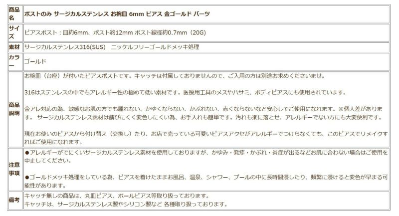 商品名 ポストのみ サージカルステンレス お椀皿 6mm ピアス 金ゴールド パーツ