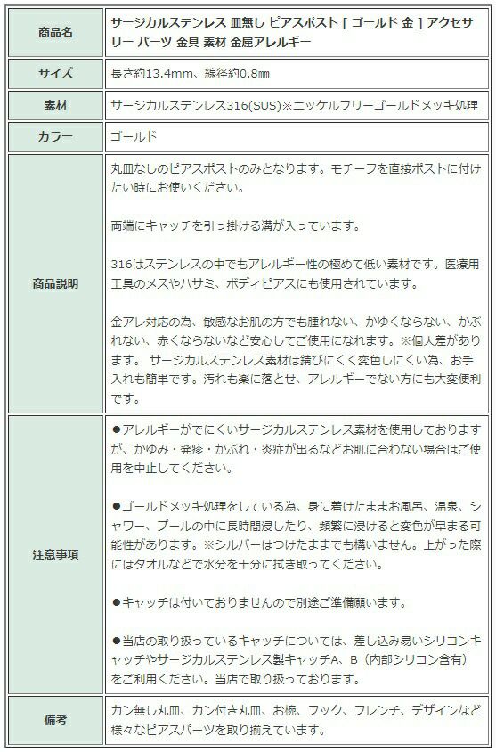 丸皿ピアスポストやカン付きピアスポスト、ボールピアスポスト、お椀皿ピアスポスト、皿無しピアスポストなどピアススタッドパーツ多数!