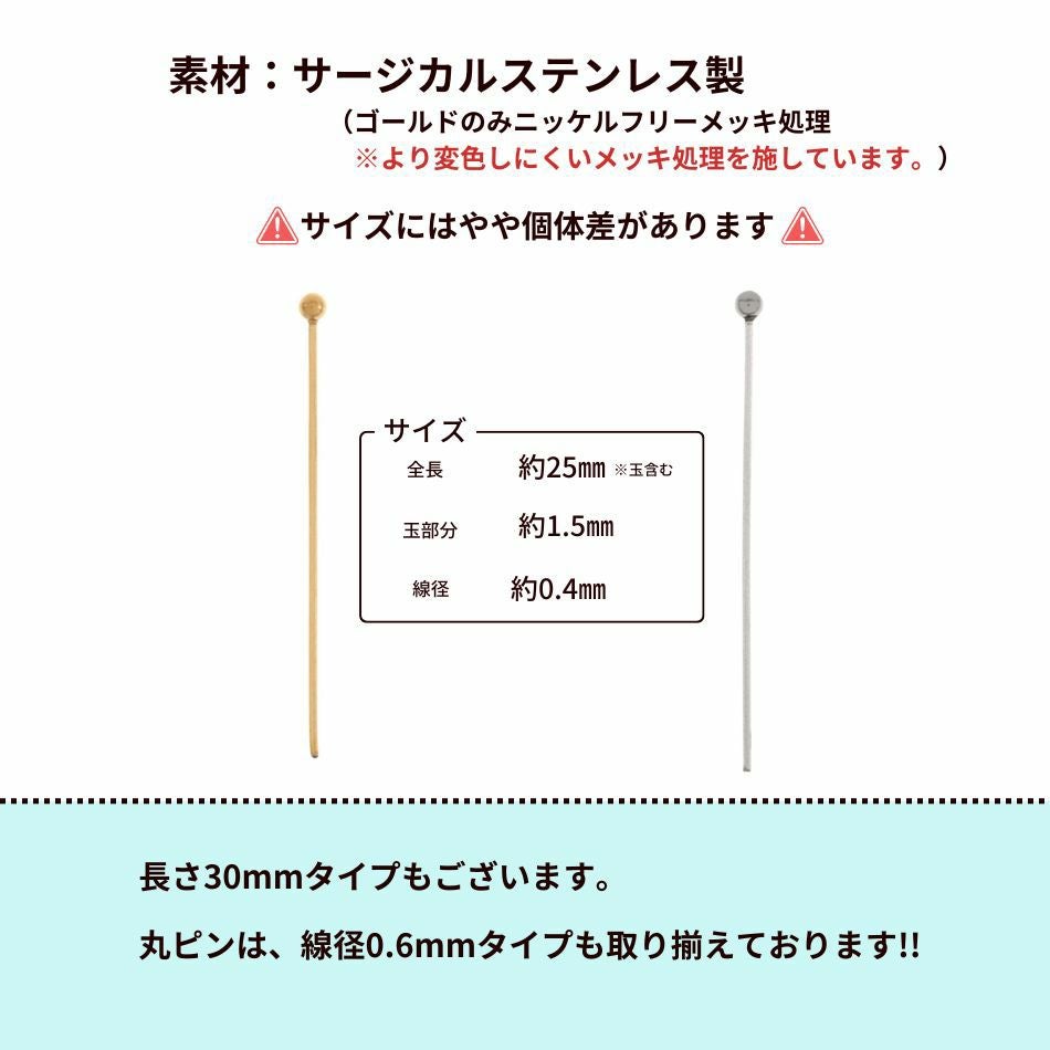 他の画像を見る 金アレ 316 素材 材料 ニッケルフリー 敏感肌 ピン丸 丸玉 先丸 極細 たまぴん 丸ピン ( 線径0.4 X 25mm ) [ 銀 シルバー ] サージカルステンレス デザインピン パーツ 金属アレルギー対応 PI-03 当店特別価格 ¥ 439 税込 〜 当店特別価格 ¥ 税込 詳細を見る お気に入りに登録する