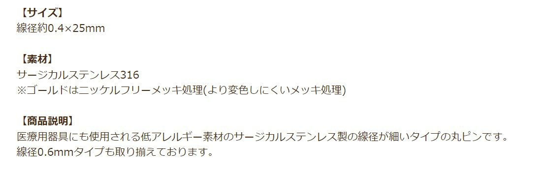 他の画像を見る 金アレ 316 素材 材料 ニッケルフリー 敏感肌 ピン丸 丸玉 先丸 極細 たまぴん 丸ピン ( 線径0.4 X 25mm ) [ ゴールド 金 ] サージカルステンレス デザインピン パーツ 金属アレルギー対応 PI-03 当店特別価格 ¥ 569 税込 〜 当店特別価格 ¥ 税込 詳細を見る お気に入りに登録する