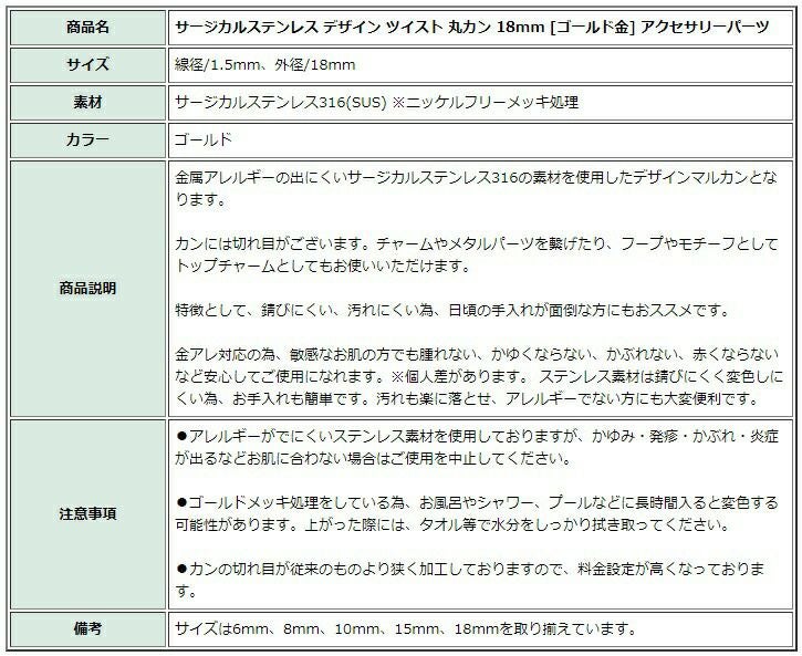 他の画像を見る * 送料込み *[20個]デザイン ツイスト 丸カン 18mm [ ゴールド 金 ] サージカルステンレス CA-03 アクセサリーパーツ 送料込み 当店特別価格 ¥ 1,508 税込 カートに入れる お気に入りに登録する