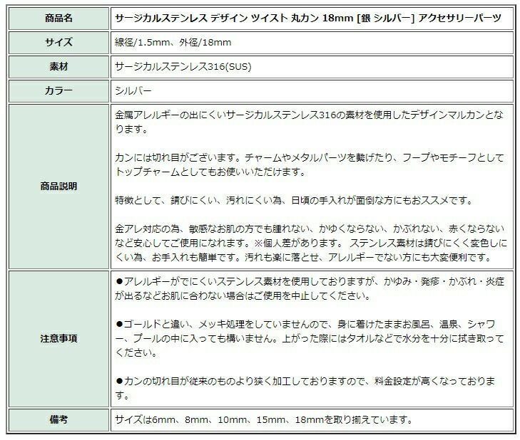 他の画像を見る * 送料込み *[20個]デザイン ツイスト 丸カン 18mm [ 銀 シルバー ] サージカルステンレス CA-03 アクセサリーパーツ 送料込み 当店特別価格 ¥ 1,076 税込 カートに入れる お気に入りに登録する