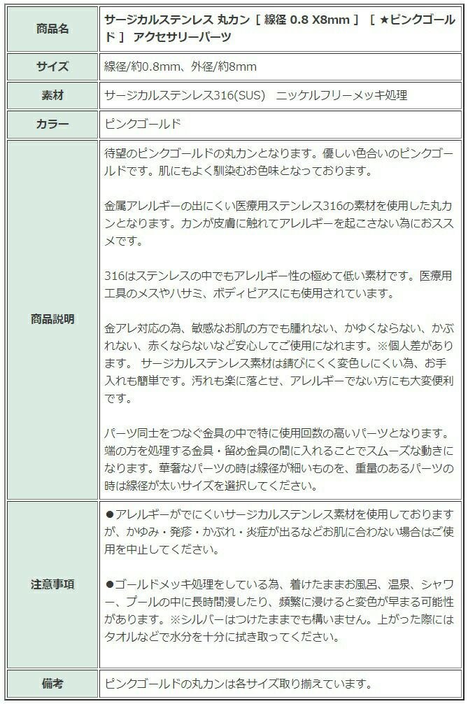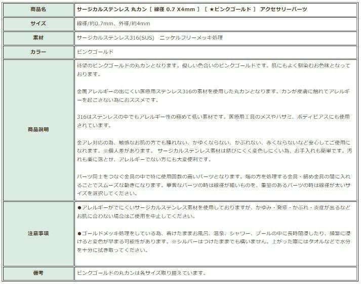 他の画像を見る 金アレ 316 素材 材料 ニッケルフリー 敏感肌 [ 丸カン 3.5mm ] [ ★ピンクゴールド ] サージカルステンレス 線径0.6mm アクセサリー パーツ 金属アレルギー対応 CA-01 当店特別価格 ¥ 299 税込 〜 当店特別価格 ¥ 税込 詳細を見る お気に入りに登録する