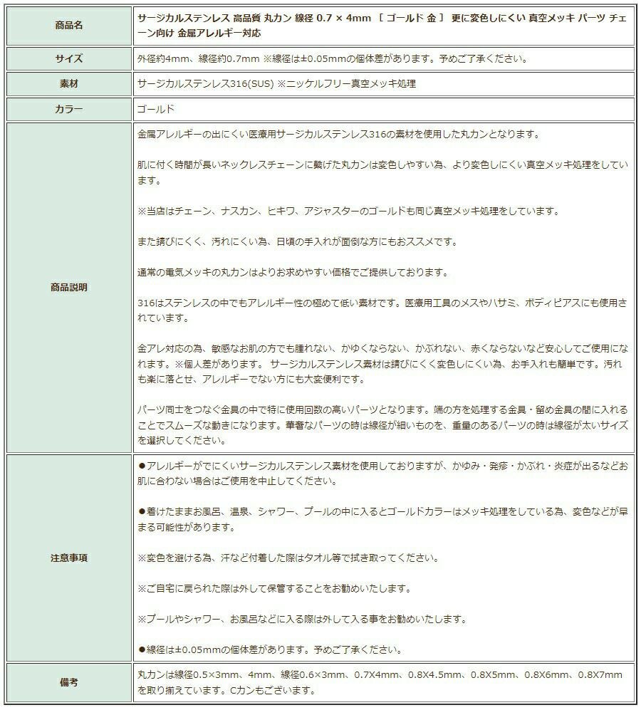 他の画像を見る 金アレ 316 素材 材料 ニッケルフリー 敏感肌 [50個][ 丸カン 極細 2mm ] [ ゴールド 金 ] サージカルステンレス 極細線径0.4mm 接続 アクセサリー 金具 パーツ CA-01 当店特別価格 ¥ 289 税込 カートに入れる お気に入りに登録する