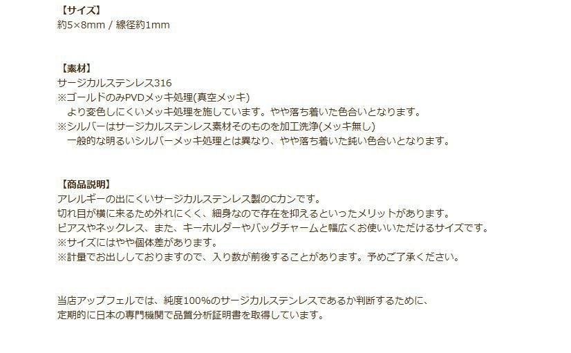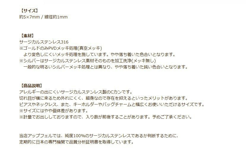 他の画像を見る * 送料込み *[20個] Cカン 細い (0.5 X 2.5 X3.5mm) [ ゴールド 金 ] サージカルステンレス アクセサリー パーツ 金属アレルギー対応 CA-02 送料込み 当店特別価格 ¥ 768 税込 カートに入れる お気に入りに登録する