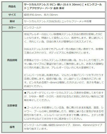 商品名 サージカルステンレス 9ピン 細い (0.6 X 30mm) [ ★ピンクゴールド ] アクセサリー パーツ 金具 素材