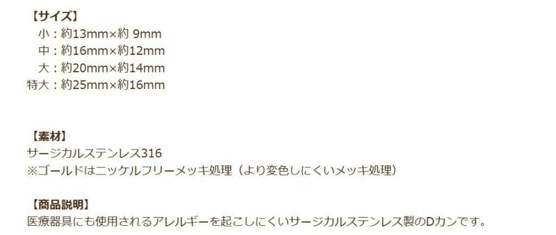 医療器具にも使用されるアレルギーを起こしにくいサージカルステンレス製のDカンです。