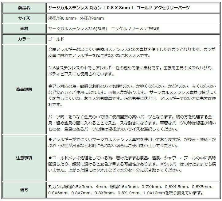 [50個] [ 丸カン 8mm ][ ゴールド 金 ] サージカルステンレス 線径0.8mm アクセサリー パーツ 金アレ CA-01