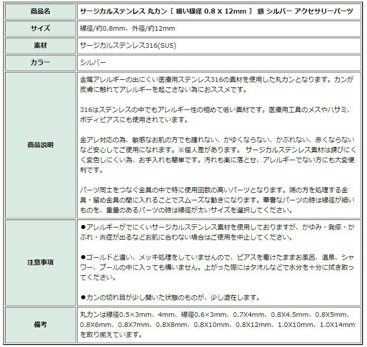 商品名 サージカルステンレス 丸カン[ 細い線径 0.8 X 12mm ] 銀 シルバー アクセサリーパーツ